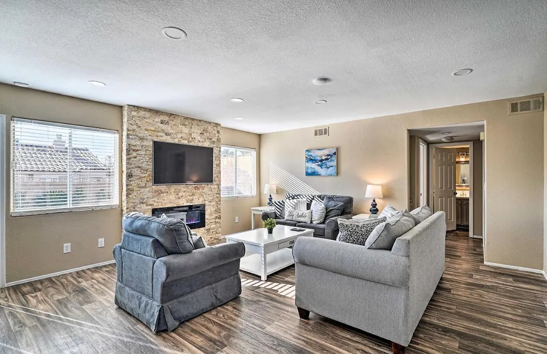 Der Innenraum ist mit einem Schreibtisch sowie WLAN und einem Flachbildfernseher mit Satellitenkanälen ausgestattet. Die Las Vegas Getaway About 8 Mi To Las Vegas Strip! verfügt über einen Steinkamin und bietet außerdem ein Bügeleisen/Bügelbrett und eine Klimaanlage in den Zimmern. Zur Ausstattung des Badezimmers gehören auch eine getrennte Toilette, eine Badewanne und eine Dusche. Gäste profitieren auch von einem Haartrockner und Badelaken.